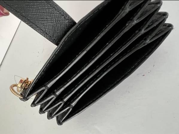 NEW without tags. Black leather accordion style, 5-slot card holder. Gold tone hardware. Flap over, snap closure. Clip chain hook. Approximately 4.25" x 2.375" No shipping.