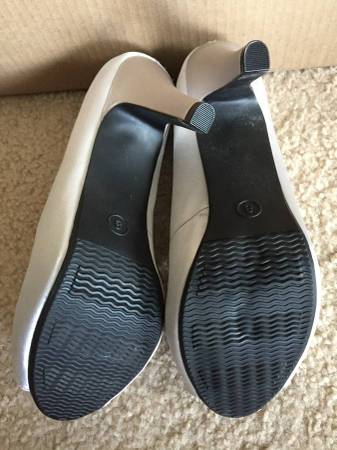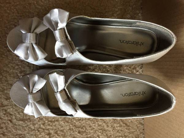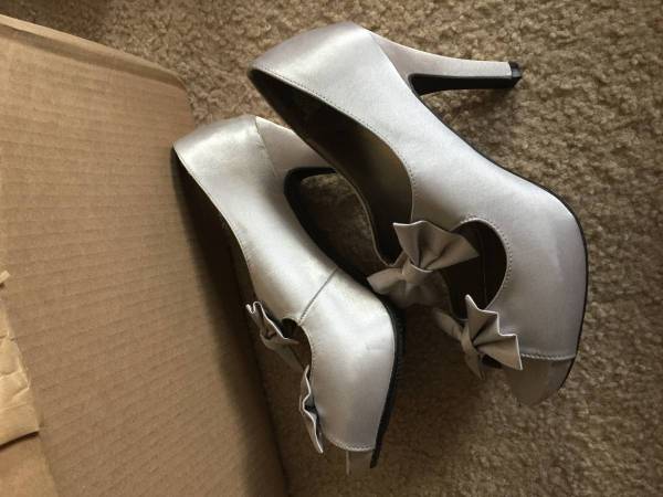 Silver Platform Pumps. Never worn. Women's Size 8. Bow detail. "Satin" uppers with rubber soles.