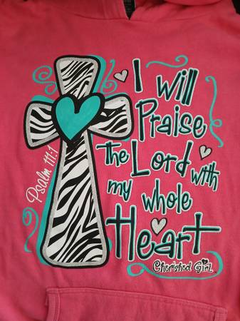 Two Christian themed tops. Both are gently used. Pink hoodie is L. Black tee is XL. Both tops for $4, cash only. Will meet at Beach Park Walgreens.