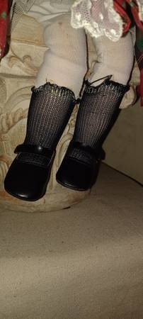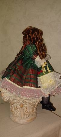 Christmas Animatronic Doll with poseable porcelain hands and head. Works great with dial on/off switch on cord. Stretched out she's 20 inches long. However, she was made to sit (she has a flat bum) so in her sitting position, she's about 14 inches tall. Her legs drop about 6 inches from her sitting position. She really is beautiful and she comes in her original box. One thing to note, she does have a run in her stocking, but on the back side of her leg. Please see photos. Prop she's sitting on is NOT included.